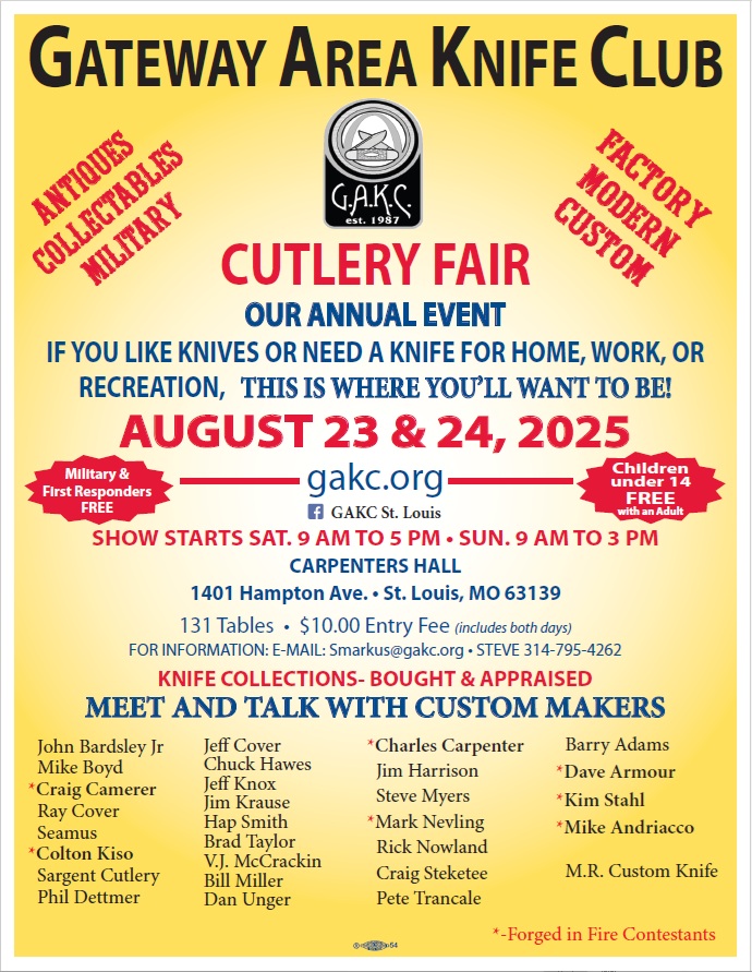 The club has a monthly meeting on the second Thursday of each month at the Carpenters Hall, 1401 Hampton Ave.St. Louis Mo. 63139. Meetings start at 6:30 pm. Visitors are always welcome.Monthly Knife Contest 2025